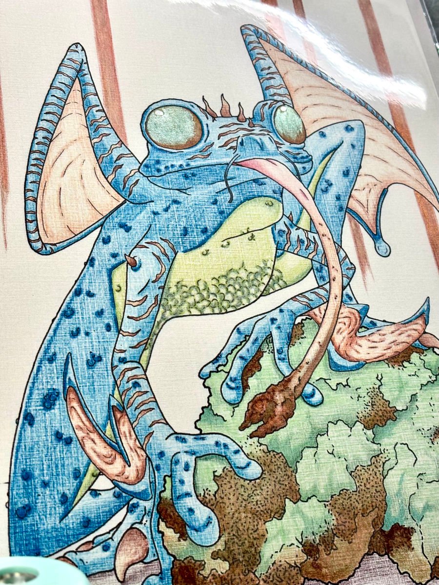 Drawn and colored on linen paper, this illustration can be tilted in the light to show off the metallic glow of watercolor paint on portions of the frog dragon and clump of copper!