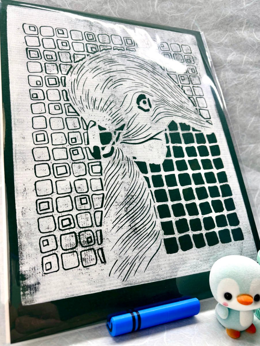 Material: Textured dark green woodblock print paper, sealed in an archival sleeve with thick card backing board, woodblock white ink