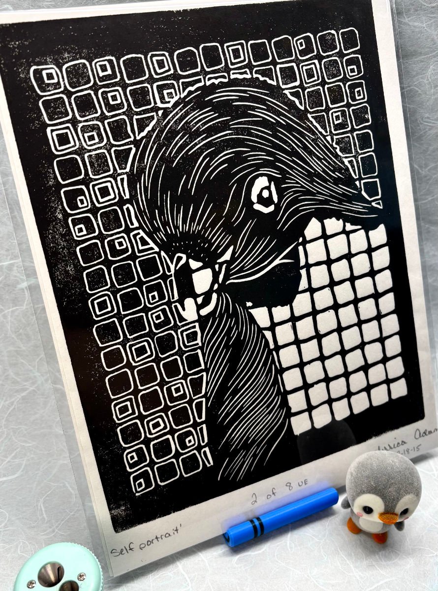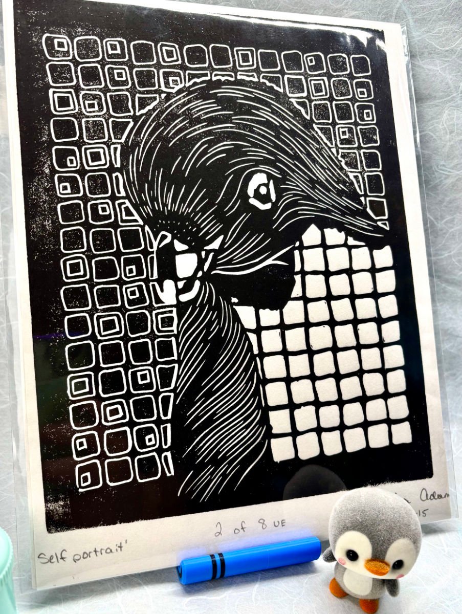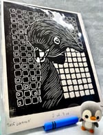 Similar in almost every way to the dark green version of Self-Portrait of a Penguin, this version has its own uniqueness to it with a higher contrast of black ink on white, creating a thicker outline and an original by its own right! Who says that a simple black and white woodblock print can't be wonderful to look at?